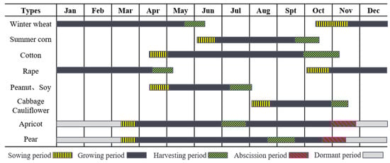 The Heilonggang region is the main production area of winter wheat and one of the most important grain production bases in China []. It is located in the east-central part of the North China Plain, in the south-central region of Hebei Province (Figure 1), with an area of about 84,800 km2 and a population of about 51.45 million. The region is located in the warm temperate zone, with a continental monsoon climate and abundant light and heat resources. The traditional agricultural cropping pattern is mainly winter wheat-summer corn in a biannual system, as well as a few cotton and peanut, soybean-vegetable cropping patterns [,]. In addition, there are also some large areas of fruit trees, such as apricot trees, pear trees and so on. According to the field surveys and relevant phenological information (http://data.cma.cn/, accessed on 5 March 2020), the phenological periods of the main crops in the study area are summarized in Figure 2. Among them, winter wheat is the main overwintering crop in the study area [,,].