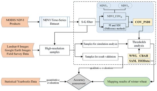 The detailed workflow for this study is schematized in Figure 3. First, we reconstructed the MODIS NDVI time-series dataset by the Savitzky-Golay (S-G) filter. Next, a rapid winter wheat extraction model (COV_PSDI) was constructed based on the phenological information analysis and NDVI time-series curve characteristics. The sensitivity of COV to NDVI curve fluctuation was used to separate cropland and non-cropland. The difference method was adopted to extract the bimodal characteristics of winter wheat. Following this, combined with the constructed slope difference index (SDI), the winter wheat in the fallow rotation area was accurately extracted. Third, we selected the sample points through the preprocessed high-resolution images. The reasonable thresholds for the parameters were determined by simulating the proportion of winter wheat in mixed pixels. Finally, the accuracy of the experimental results were evaluated and compared by calculating the overall accuracy (OA), producer accuracy (PA), user accuracy (UA), and percentage error (PE) of different methods, to verify the feasibility of the method.