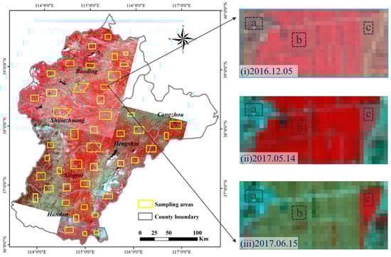 Research area map and sample data from Landsat-8 OLI images in Heilonggang region. The ranges of the sample areas are indicated by yellow lines. (i–iii) represent the OLI images at overwintering, heading and harvesting stages of winter wheat, respectively. Rectangle a is characterized by build-up land; rectangle b is characterized by winter wheat; rectangle c is characterized by other vegetation.