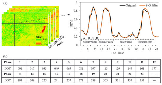 (a) NDVI time series profiles before and after Savitzky-Golay (S-G) filter; (b) the date of MODIS images corresponding to each phase. The letters below the time-series profiles in (a) denote different phenological phases of winter wheat. A: overwintering, B: greening to jointing, C: heading to grouting, D: maturing to harvesting. DOY, the day of a year.