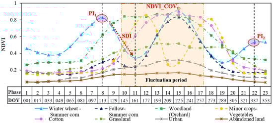 NDVI_COV represents the variation coefficient of the NDVI time series, that is, the ratio of the standard deviation to mean of the NDVI time-series of each pixel [,]. NDVI_COV is used to eliminate non-cultivated land information and reduce the interference of background land cover information, such as woodland (orchard), grassland and construction land. As shown in Figure 6, the NDVI curve of construction land is at a low value throughout the year. The growth of forest and grassland is stable from May to September (i.e., phase 9 to 16), and the NDVI time series curve fluctuation is small. However, during this period, due to crop harvesting and sowing, the NDVI time series curve of cultivated land fluctuates greatly. This study defines this period as a fluctuation period. Therefore, the NDVI_COVfp is constructed by using the sensitivity of COV to NDVI curve fluctuation.