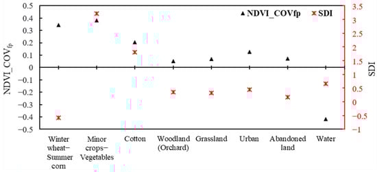 The reasonable setting of NDVI_COVfp and SDI threshold is crucial for winter wheat mapping []. Compared with woodland, construction land and bare land, the NDVI curve of winter wheat–summer corn fluctuates greatly during the fluctuation period, and the NDVI_COVfp value (0.34) is high (Figure 7). However, the NDVI_COVfp value of small crops–vegetables is also high, and winter wheat could not be effectively extracted only through the NDVI_COVfp. The SDI value of winter wheat is negative and lower than −0.50. Combining the NDVI_COVfp and SDI with the bimodal characteristic of winter wheat, the extraction of pure winter wheat pixels is relatively simple. However, selecting a reasonable threshold to extract winter wheat from mixed pixels is a difficult issue. In order to simplify the mixed pixel issue, this study defines that, if most of the area (50% or more) in a pixel (250 m × 250 m) is covered by winter wheat, it is defined as a pure winter wheat pixel []. Based on the NDVI values of pure pixels of different land cover types, the threshold is determined by analyzing the index values and the percentage of winter wheat in the mixed pixels with 10% winter wheat mixing ratio as the increment. Whereas, the NDVI values of mixed pixels with various area percentages were detected by simulation analysis based on the NDVI values of pure pixels of different land cover types. For instance, assuming that the NDVI values of winter wheat pure pixels and forest pure pixels in phase t are NDVIWheat,t and NDVIForest,t, respectively. The NDVI values of mixed pixels with 90% of winter wheat and 10% of forest in phase t are NDVImixed = 0.9 × NDVIWheat,t + 0.1 × NDVIForest,t. Afterward, the parameter values were calculated based on the simulated NDVI values of various mixed pixels in different periods.