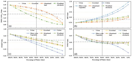 Model threshold analysis results: variation of (a) NDVI_COVfp, (b) SDI, (c) CBAH, and (d) WWI with changes in proportion of winter wheat in mixed pixels.