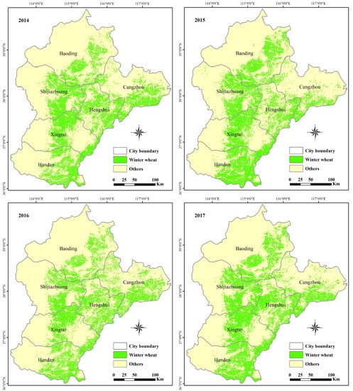 Based on the COV_PSDI method and threshold analysis, the spatial mapping of winter wheat in Heilonggang and its surrounding areas from 2014 to 2017 was completed (Figure 9). All pixels were classified into two categories, i.e., winter wheat and non-winter wheat. Figure 9 illustrated that the spatial distribution of winter wheat was quite different. Winter wheat is mainly concentrated in the central and western plains, Baoding, Shijiazhuang, Handan, central Xingtai, southern Cangzhou and Hengshui. The reasons for the lower distribution of winter wheat in the west and northeast might be that the west of Heilonggang is mostly mountains, and land salinization is a serious issue in northern coastal areas of Cangzhou. Therefore, there are few suitable areas for winter wheat planting. This distribution pattern is consistent with the existing literature [,].