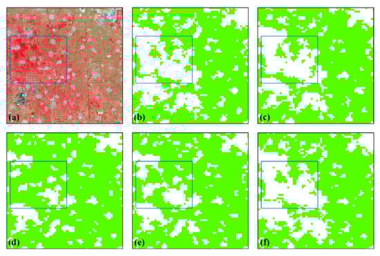Comparison of different winter wheat mapping methods. (a) 30-m Landsat-8 OLI image combined as false color (5/4/3) on 8 June 2017. Extraction results using (b) COV_PSDI, (c) SAM, (d) ISODATA, (e) CBAH, and (f) WWI.
