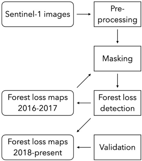 The overall method is summarized in the flowchart in Figure 2 and includes pre-processing, masking, the detection of forest loss areas for the years 2016 and 2017 (used to improve the quality of the forest/non-forest map), forest loss detection from 2018 using the improved forest/non-forest map, and the validation of the final maps.