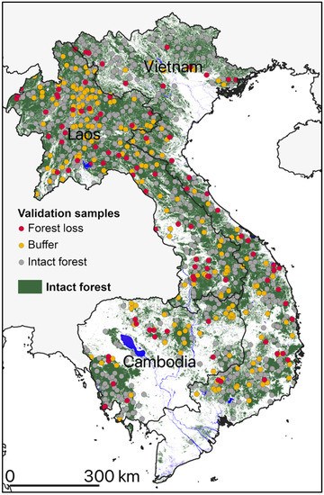 We selected as our sampling design a stratification with strata defined by the map classes, mainly to improve the precision of the accuracy and area estimates. We selected a buffer stratum in addition to an intact forest stratum and a forest loss stratum, as recommended by [18]. We specified a target standard error of 0.01 for the overall accuracy and supposed that the user accuracies of the change class were 0.70 for forest disturbances and 0.90 for intact forest. The resulting sample size was therefore 803 in total, which we rounded up to 1000 samples. We then assessed the allocation of the sample to strata so that the sample size allocation resulted in precise estimates of accuracy and area. We followed Olofsson’s recommendations and allocated a sample size of 100 for the forest disturbance stratum, then allocated the remainder of the samples to the intact forest classes—i.e., 200 in the buffer areas around detected disturbances and 700 in intact forest outside of these buffers. Figure 3 shows the location of the 1000 samples in the study area.