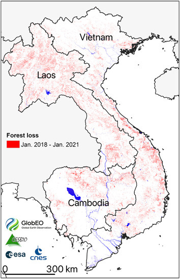 In this context, the primary objective of this study was to provide weekly forest loss maps over Vietnam, Cambodia, and Laos using Sentinel-1 data with the forest loss detection method from [13]. We selected an adapted forest definition and relevant ancillary data and ran our processing chain through the high-performance computing cluster of CNES. The resulting map provided clear hints of the spatial and temporal distribution of forest losses. For example, the difference between the high forest losses currently occurring in northern Laos and the low forest losses occurring in northern Vietnam can clearly be seen, although the whole northern mountainous region is covered by similar forest types. We also found that approximately half of the forest disturbances in Cambodia occur in protected areas.