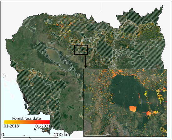 Map of forest loss and protected areas (hatched areas) made using the database from [34]. Approximately half of forest disturbances in Cambodia occur in protected areas.