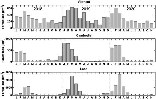The temporal distribution of detected forest loss over Vietnam, Cambodia, and Laos from 2018 to 2021 is shown in Figure 7. Forest loss is detected throughout the year, in particular in Vietnam, with an expected and systematic peak of losses occurring during the dry season between December and April in the three countries. Note that this finding may be exacerbated by the fact that soil moisture can lead to an underestimation of forest loss. Figure 7 also highlights a strong decrease in forest loss at the end of the 2020 dry season, particularly in April and in Vietnam, compared to 2018 and 2019. This may be because Vietnam decided to suspend cross-border activities with Cambodia and Laos in April 2020, thus preventing it from importing wood and thereby curbing forest loss. This hypothesis does not contradict the fact that forest loss may have intensified locally in some regions since the appearance of COVID-19 due to the lack of on-site inspection interventions.