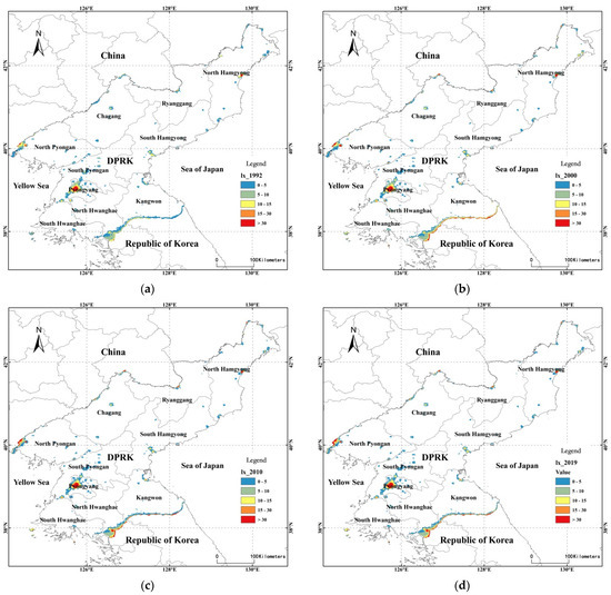 Taking Pyongyang, Chungjin, and Hamhung as typical cities, we reveal the law of urban dynamic expansion of the three cities in the past 28 years. In terms of urban area, Pyongyang, Chungjin, and Hamhung did not expand significantly from 1992 to 2019, and Chungjin has even decreased. However, TDN and MDN of the three cities showed an increasing trend (Table 3). They increased the most in Pyongyang (TDN increased by 3198 and MDN increased by 10.14), they increased slightly in Hamhung (TDN increased by 187 and MDN increased by 1.14), and they increased slightly in Chungjin (TDN increased by 67 and MDN increased by 8.33). From the maximum and minimum values of TDN and MDN, Hamhung remains basically unchanged, but the range in Pyongyang and Chungjin has increased significantly.