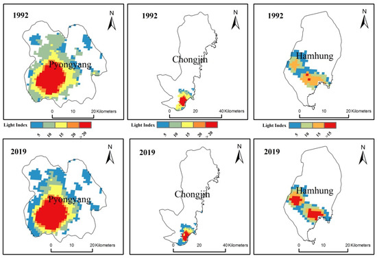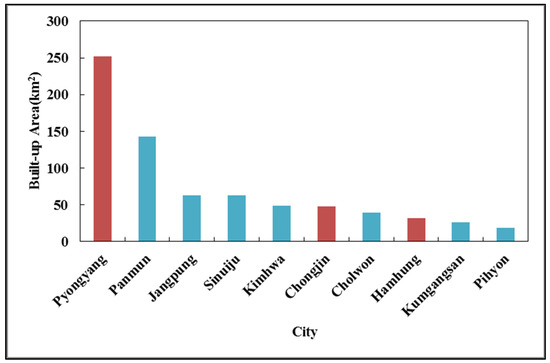 From the perspective of urban spatial scale, there are large gaps between different cities in the DPRK, and the number of relatively large cities is limited. Selecting typical cities in the DPRK as the research objects can help to understand its development. According to the statistical results for urban built-up area in 2019, the top ten cities in the DPRK are Pyongyang, Panmun, Jangpung, Sinuiju, Kimhwa, Chungjin, Cholwon, Hamhung, Kumgangsan, and Pihyon (Figure 5). Note that because of light-space overflow at the DPRK’s borders with China and the ROK [42], the statistical results for cities located at a border are often affected by cities of the neighboring country, as is the case for Sinuiju, Pihyon, and Kaesong (Panmunjom), for example. Therefore, the cities at the borders are not included as typical cities in the comparative analysis. Based on the statistical results and the locations of urban areas, Pyongyang, Chungjin, and Hamhung are selected as typical cities. Pyongyang is located in the middle of the DPRK, and Chungjin and Hamhung are located in its eastern coastal area, neither of which are affected by the spatial spillover effect.