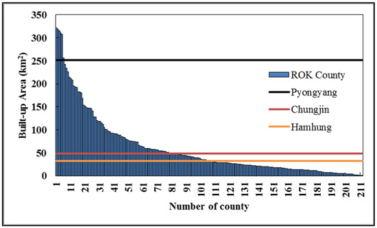Similarly, the built-up area of Pyongyang is similar to that of Pyeongtaek in Gyeonggi, and the TDN and MDN values are lower than those of the latter (the TDN and MDN values of Pyongyang are 22,755 and 88.25 lower, respectively, than those of Pyeongtaek). The comparison results for Chungjin and Hamhung are similar.