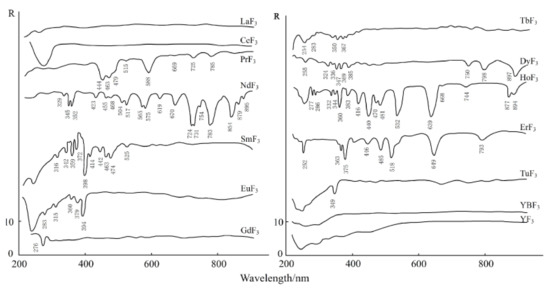 - Batsanov, S.S.; Derbeneva, S.S.; Batsanova, L.R. Electronic spectra of fluorides, oxyfluorides, and oxides of rare-earth metals. J. Appl. Spectrosc. 1969, 10, 240–242. [Google Scholar] [CrossRef]