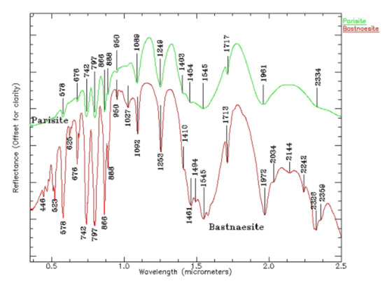 - Turner, D.J.; Rivard, B.; Groat, L.A. Visible and short-wave infrared reflectance spectroscopy of REE fluorocarbonates. Am. Mineral. 2014, 99, 1335–1346. [Google Scholar] [CrossRef]