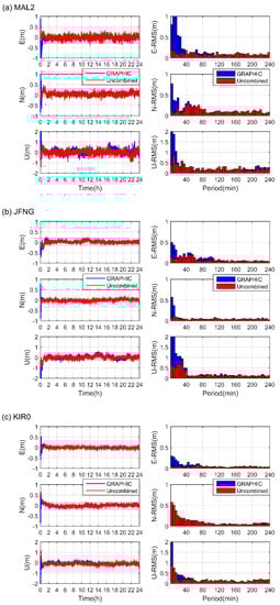Three stations at different latitudes were selected for illustration. As seen in Figure 2, the positioning errors and RMS values of GRAPHIC and uncombined models at the (a) MAL2 (low latitude), (b) JFNG (middle latitude), and (c) KIR0 (high latitude) stations on 26 October 2020 are presented. For each station, the left panels depict the time series of the positioning errors in the east (E), north (N), and up (U) components for the whole day period, respectively, while the right panels illustrate the RMS values every 5 min in each component for the first 4 h. Both the GRAPHIC and uncombined approaches achieved sub-meter positioning accuracy for these three stations. For the east and north components, the positioning precision reached at 0.1 m level, and 0.2 m for the vertical component. The MAL2 showed larger variations than the other two stations in all three components, which should be because the ionosphere activity was higher at low latitudes. The GRAPHIC and uncombined approaches exhibited different positioning convergence speeds. Comparatively, the uncombined model approach showed generally faster convergence than GRAPHIC, and its variations were much more stable. During the first 15 min, positioning errors of GRAPHIC SF-PPP even reached several meters, especially in the up direction, while the uncombined model was less than about 0.5 m and 1 m in the horizontal and vertical directions, respectively. This should be mainly attributed to the code and carrier phase combination in GRAPHIC approach being much noisier than the carrier phase observations in the uncombined approach.
