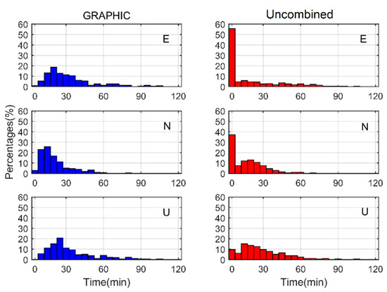 To compare the overall convergence performance, the convergence times for all the 40 MGEX stations for the whole week were calculated. The convergence criteria were set as the positioning errors in the E, N, and U directions keeping less than 0.3 m, 0.3 m, and 0.5 m, respectively, for at least 10 min. In Figure 3, the distribution diagram of convergence time is depicted. It can be observed that the uncombined SF-PPP converged faster than GRAPHIC. For the results of the uncombined model, there was 55% for the east solutions, 40% for the north solutions, and 10% for the up solutions, which could converge within 5 min. In contrast, there were few solutions of the GRAPHIC model that could converge within 5 min.