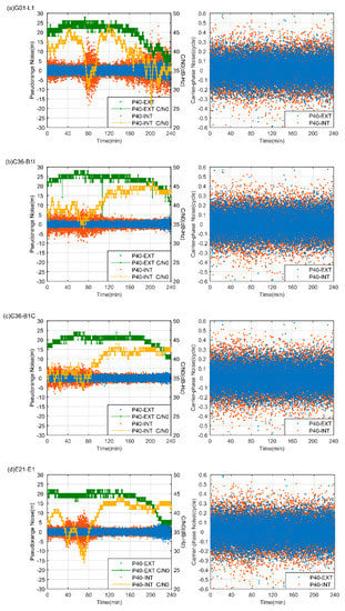 The noise level of the pseudorange and carrier phase of P40 GNSS observations were evaluated by third-order between-epoch differences [3]. In Figure 5, the noise of P40-INT and P40-EXT pseudorange and carrier-phase are depicted for different GNSS systems over 4 h; the C/N0 are also illustrated to investigate their correlations. It should be noted that the selected periods are the same for different satellites, and the B1I and B1C signals for C36 are both illustrated as an insight on BDS-3 new signal evaluation with smartphones. As seen in Figure 5, the P40-INT data experienced large C/N0 variations from 25 dB-Hz to 40 dB-Hz. The G01 satellite from P40-INT showed the largest C/N0 variations, followed by E21. They exhibited a large C/N0 decrease over 60–80 min from approximately 40 dB-Hz to about 30 dB-Hz with a reduction as large as 12 and 10 dB-Hz, respectively. This should be attributed to signal acquisition incidents of the P40-INT devices, as such a decrease was not seen for P40-EXT. The E21 C/N0 also showed another minor decrease of 5 dB-Hz at around 40 min. However, the two BDS signals showed much smaller C/N0 fluctuations. Their C/N0 stayed at a rather lower C/N0 level (35 dB-Hz) during the first 60 min and then gradually grew to larger than 40 dB-Hz. Comparatively, the B1I C/N0 values were, overall, 2 dB-Hz larger than B1C. The P40-INT code triple-difference series showed strong correlations with respect to the C/N0 variations. The E21 and C36 code variations were within +/−3 m when their C/N0 stayed above 40 dB-Hz, while G01 were larger, at around +/−5 m. However, when C/N0 dropped below 30 dB-Hz, their variations amplified to about 10 m. The carrier-phase triple-differences mainly fluctuated around +/−0.5 cycles and barely showed any correlations with respect to C/N0. The P40-EXT C/N0 values manifested gradually variations, which were typically above 40 dB-Hz for elevations higher than 30 degrees. This was consistent with Figure 4. As result, the P40-EXT code triple-differences stayed stably within +/−3 m, while the carrier-phase was around +/−0.5 cycles.