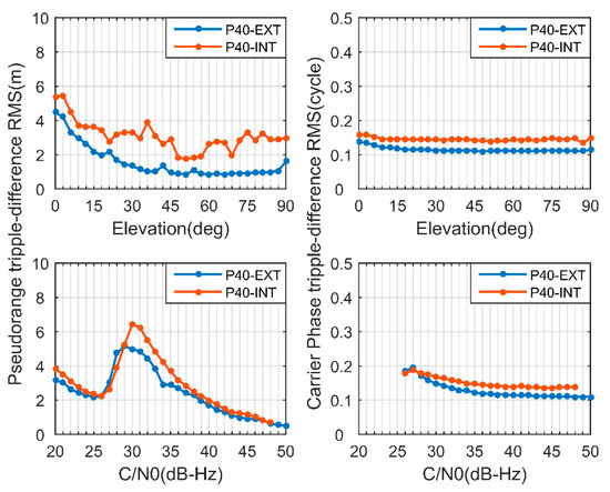 The GNSS measurement noises are derived from the above triple-difference RMS values by a normalization factor of [3]. The P40 observation noise of different constellations is then calculated and shown in Table 3. The BDS B1C code noise was the smallest for both P40-EXT and P40-INT with values of 0.28 m and 0.41 m, respectively, while the GPS L1 was the largest with values of 0.56 m and 0.99 m, respectively. The BDS B1I and Galileo E1 showed very similar code noise levels at 0.40 m and 0.60 m, respectively. The noise level for different systems might be related to their C/N0 levels, as indicated in Figure 5. The average pseudorange noise values were 0.40 m and 0.67 m for P40-EXT and P40-INT, respectively, indicating about 70% improvement using an external geodetic antenna. For the carrier phase observations, the noise level of different GNSS systems were quite close to each other and their RMS values were 0.02 cycle and 0.03 cycle for P40-EXT and P40-INT, respectively.