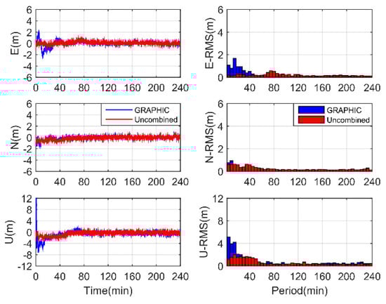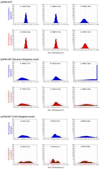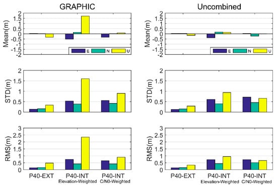 The histograms of P40-EXT and P40-INT SF-PPP positioning errors during the last 120 min are shown in Figure 10. In Figure 10a, it could be seen that the GRAPHIC positioning errors of the P40-EXT case achieved comparable performance with the uncombined method. Their horizontal fluctuations varied within 0.5 m and their RMS values varied around 0.15 m. However, the uncombined approach showed much smaller errors in the vertical component with an improvement of about 30%, consistent with Figure 8. Figure 10b,c depict the P40-INT SF-PPP errors using the elevation-dependent weighting model and the C/N0-dependent weighting model, respectively. Generally, the uncombined method overperformed the GRAPHIC method in the vertical component with dramatic improvements; for the elevation-dependent weighting model, the RMS reduction was about 1.40 m, while for C/N0-dependent model it was about 0.24 m. Their horizontal precisions were at a similar level below 1.0 m. Compared to the elevation-dependent weighting model, the C/N0-dependent model showed much better vertical precision at 0.66 m.