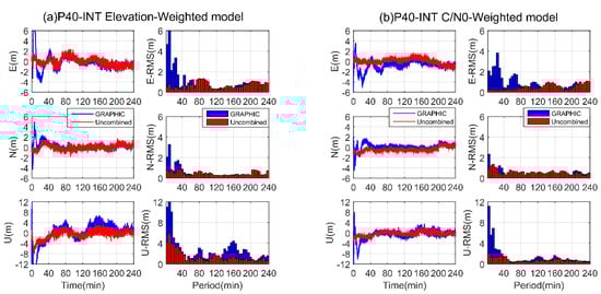 Considering the code noise correlation with respect to C/N0, the P40-INT SF-PPP was evaluated using a C/N0-dependent weighting model in addition to the elevation-dependent model for comparison. The C/N0-dependent weighting model was represented in an exponential form related to the instantaneous C/N0 of the observations, a maximum C/N0 value for cutoff, and the corresponding pseudorange noise at maximum C/N0. Its detailed expression could be found in [42]. Considering the P40-INT noise analysis results in Section 4.1, the C/N0-dependent weighting model was adapted by setting the maximum C/N0 cutoff as 40 dB-Hz and the corresponding pseudorange noise 1 m. The positioning errors are shown in Figure 9a,b. Generally, the positioning errors of P40-INT varied abruptly and needed a longer convergence time for both SF-PPP approaches and for both weight models than P40-EXT. Considering the elevation-dependent weighting model, both the GRAPHIC and uncombined approaches manifested large variations around ±2 m in the horizontal component and ±6 m in the vertical component even after convergence; very similar systematic errors could be observed for both approaches, which might be due to some systematic observation errors and remains under investigation. Comparatively, the uncombined approach showed smaller positioning errors, especially at the vertical component. With the C/N0-dependent weighting model, the P40-INT positioning results showed a significant improvement over the elevation-dependent model for both SF-PPP approaches with smaller variations. Especially, the vertical error variations were within ±4 m. However, the systematic errors were still found.