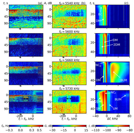 The four cycles described above were collected during 14:55–15:15 and 16:00–16:05 AKDT. During the cycles performed during 16:05–16:25 AKDT, the ionosphere descended, the PW reflection heights zr0 were lower, i.e., zr0~215–225 km, and the nominal values of the fourth gyroharmonic were larger by 50–70 kHz. The results of these four cycles are shown in Figure 3 and Figure 4. During the first three cycles (f0 = 5600, 5630 and 5660 kHz), the PW frequencies were f0 < 4fc; in the last cycle (f0 = 5730 kHz), f0 4fc. According to the SEE spectrograms (Figure 3c), the PW frequency f0 = 5600 kHz (upper row) was in between the weak emission range and below harmonic range: the DM and UM were weak but stronger than at f0 = 5540 kHz, and the 2DM was barely resolvable. For an increase in f0 by 30 kHz in each of the next two cycles (f0 = 5630 kHz and 5660 kHz), the PW frequencies belonged to the below harmonic range) and f0 approached 4fc from below. This was confirmed by amplification of the DM, 2DM and UM in the spectrograms (Figure 3c). Using the ionograms and IGRF model, the offsets Δfc during the three cycles with f0 < 4fc could be roughly estimated as Δfc~−(110–130), −(90–100) and −(55–65) kHz. Note that the SEE spectrogram in Figure 1c at f0 = 5600 kHz was similar to the ones at f0 = 5630 kHz in Figure 3c. This shows that the offsets Δfc were close in these cycles. This happened because of a decrease in the ionosphere and an increase in the magnetic field strength at the lower heights.