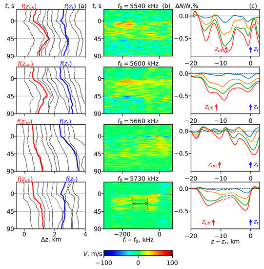 The following is an analysis for this time interval from the cycle with f0 = 5540 kHz, which is shown in the upper rows of Figure 1 and Figure 2. During this cycle, the pump frequency f0 = 5540 kHz belonged to the weak emission range between the third and fourth gyroharmonics, where the SEE spectrum contained weak BC, DM and UM (Figure 1c, row 1). In this range, the offset Δfc = f0 − 4fc could be roughly estimated from the ionograms and geomagnetic field IGRF model as Δfc ~−(130–150) kHz, where fc should be taken at z = zUH0, the upper hybrid resonance height of the pump wave. The AA, UH-related SEE and UHD started to develop during t = 1–3 s after the QCW was switched on. The expulsion from the UH height interval corresponded to the appearance of the expanding range with decreasing fdi near in Figure 1a, row 1. During 3–5 s, the UHD became deeper than the RD (Figure 2c, row 1, Figure 5c), and then the UHD developed monotonously till the QCW pumping was switched off. At t~15 s, the uplifting near the reflection point Δzr(fi ≈ f0) accelerated again and continued till the QCW stopped; for s, deepening of the UHD and RD was accompanied by a plasma density decrease in the whole altitude range (Figure 2c, row 1).