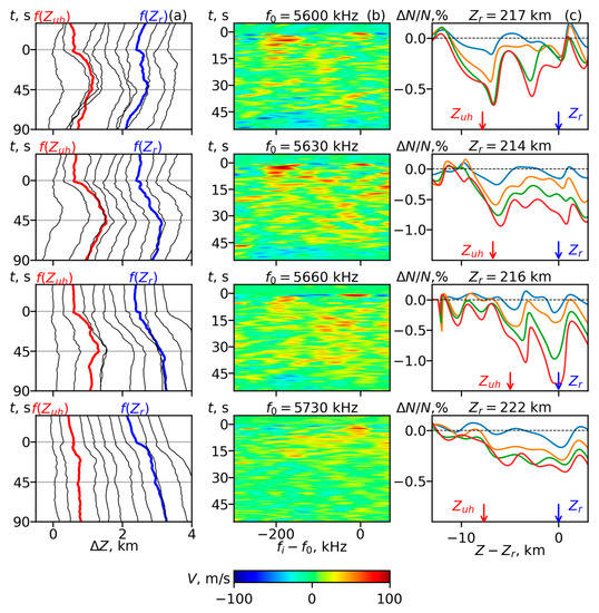 Results of the phase data processing for the PW reflection heights zr0 230 km. The PW frequencies f0 are shown above the (b) panels. Column (a): Temporal variations of the reflection height shifts of different spectral components of the sounding pulses Δz (fi, t) for different cycles. The frequency step between shown spectral components Δfi = 60 kHz, starting from f0. An additional height shift of 300 m between the reflection heights of the successive shown frequencies fi at t = 0 was added for clarity. Red and blue lines correspond to the spectral components that were reflected from zUH and zr. Column (b): Velocity of the sounding waves reflection height displacement Vv = ∂Δzr (fi, t)/∂t vs. time and frequency. Column (c): Relative variations of the electron density [N(t) − N(0)]/N(0) vs. height at t = 5 s (blue), 15 s (orange), 30 s (green) and 45 s (red) in the same cycles. Double arrows show the contaminated frequency range for the data processing.