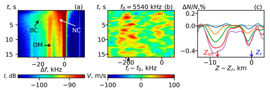 Calculating the altitude shifts Δzr(fi, t) allowed us to observe the evolution of the electron density profile N(z, t) from the reference one. The reference profile N0(z, t0) was taken from the ionogram that was registered prior to the QCW pumping session. For this, we transformed Δzr(fi, t) to Δzr(N, t) by using the univocal relation between the plasma frequency at the radio wave reflection point and electron density. Therefore,