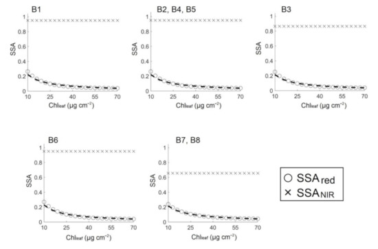 PROSPECT model-simulated relationship between Chlleaf and SSA for different vegetation types. Each dot (○ or ×) represents the PROSPECT-modeled SSA with the corresponding Chlleaf, and the dashed line denotes the regression equations between the Chlleaf and SSAred recorded in Table 5. B1 represents grasses and cereal crops (GRA), B2 represents shrubs (SHR), B3 represents broadleaf crops (CRO), B4 represents savannas (SAV), B5 represents evergreen broadleaf forest (EBF), B6 represents deciduous broadleaf forest (DBF), B7 represents evergreen needle forest (ENF), B8 represents deciduous needle forest (DNF).