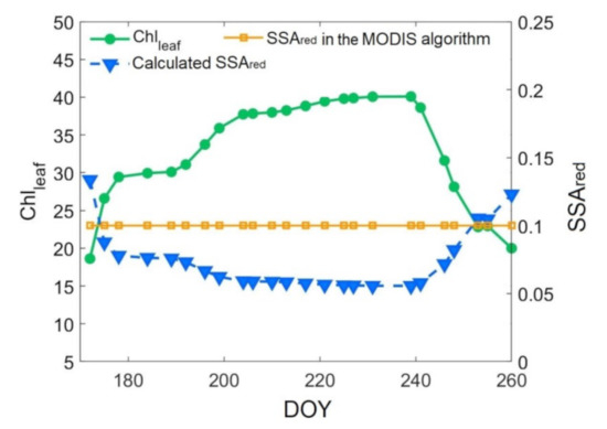 The continuous ground-measured Chlleaf data in one growing season of the soybean samples from the literature [70] and the corresponding SSAred are plotted in Figure 4. Chlleaf showed an expected tendency associated with budburst and chlorophyll biosynthesis after the day of year (DOY) 172, as well as chlorophyll breakdown in autumn (after DOY 239). The SSAred had an inverse tendency with Chlleaf. SSAred exceeded 0.13 before DOY 172 and then decreased sharply by approximately 0.06, reaching 0.078 in the following 6 days, when Chlleaf increased from 18.6 μg cm−2 to 29.4 μg cm−2. Then, SSAred experienced a relatively slow-declining period until DOY 204 (decreased by approximately 0.02 in 26 days), while Chlleaf still increased steadily from 29.4 μg cm−2 to 37.7 μg cm−2. On DOY 204–239, Chlleaf remained stable at 37.7–40.1 μg cm−2, and SSAred remained at 0.05–0.06. From approximately DOY 240, SSAred started to increase and exceeded 0.12, and Chlleaf dropped from 38.6 μg cm−2 to 20.0 μg cm−2. As shown in Figure 4, SSAred changed dramatically from 0.13 to 0.05 during the whole soybean growing season. The fixed SSAred in the current inversion algorithm was usually set to be the average value in the whole growing season for the specific biome type, which overestimated SSAred in the period of high Chlleaf.