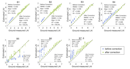 Accuracy of LAI inversion for each biome before and after SSAred correction. B1 represents GRA, B2 represents SHR, B3 represents CRO, B4 represents SAV, B5 represents EBF, B6 represents DBF, B7 represents ENF, B8 represents DNF.