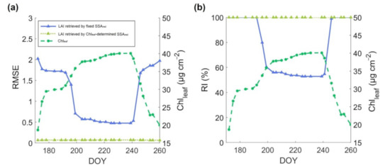 Figure 6 illustrates the accuracy of LAI inversion in one growing season using the 3D-RTM simulated reflectance. The leaf chlorophyll content was set as the ground-measured values, as shown in Figure 4. RMSE of the retrieved LAI using the fixed SSAred algorithm was larger at the start and end of the growing season (Figure 6a). With the increasing of Chlleaf, RMSE dropped dramatically and remained stable at approximately 0.5 during DOY 204–241. RI decreased dramatically to 52.8%–56.0% on DOY 204 and DOY 241 (Figure 6b), and previous research proved the algorithm tended to fail more often in the summer period [71]. The Chlleaf-determined SSAred algorithm showed higher accuracy (RMSE < 0.1) and stability (RI = 100%) in the whole growing season.