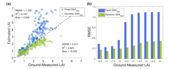 Figure 7a validated the LAI inversion using the ground-measured data from the Xiao Tangshan site. The LAI retrieved by the 3D-RTM model with the fixed SSAred (0.18 for cereal crops), as in the MODIS LAI product algorithm [21], had a significant overestimation with RMSE of 1.338, bias of 0.856, and R2 of 0.747. The dynamic SSAred algorithm performed better with RMSE of 0.511 and R2 of 0.825. When LAI was higher than 2, the RMSE of the fixed SSAred algorithm increased to 1.786, which indicated that large inversion error occurred under high LAI and high Chlleaf values. RMSE of the dynamic SSAred algorithm was 0.513 when LAI was larger than 2, which was nearly the same as the overall RMSE (0.511). Figure 7b illustrated the average RMSE with an LAI interval of 0.5. It also shows the high inversion error under large LAI and Chlleaf conditions for the fixed SSAred algorithm. The accuracy of the dynamic SSAred algorithm was relatively stable for different LAI values with RMSE less than 0.6.