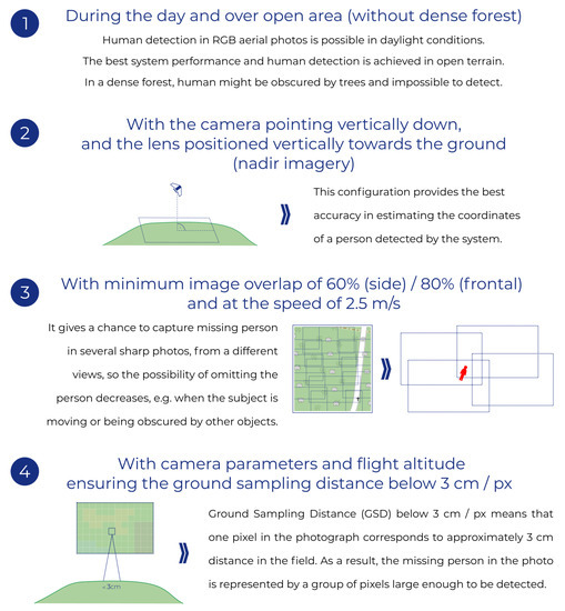 Recommended parameters of the photogrammetric flight are the following: (1) side overlap of approximately 60–70%; (2) front overlap of approximately 80%; (3) altitude so that GSD does not exceed 2 cm/px (3 cm/px at worst); (4) platform horizontal velocity of approximately 2.5–3.0 m/s. The considerable side and front overlaps mean that every point is photographed from a number of different camera locations, increasing the probability of capturing a person who may be obscured by other land cover objects (Figure 3). The small GSD values guarantee a sufficient level of detail and help the detector to differentiate between persons and similar objects. Moreover, small GSD values facilitate the human-assisted verification of hits provided by the system. The low platform horizontal velocity positively influences the sharpness of aerial imagery. In addition, the location of take-off site must be recorded for each flight. This makes the system compatible with various platforms, which record altitudes using different vertical reference systems. New models of digital cameras must be consulted with the SARUAV manufacturer prior to the software use.