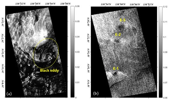 The data used in this article were the two FP ALOS PALSAR images (#A and #B) collected from the sea around Japan. These two scenes are covered with suspected W-E and B-E, respectively. In terms of eddy existence authenticity verification, Section 2 discussed the flow field characteristics of the study area, the frequency of ocean eddy occurrence, the eddy formation mechanism, and the resultant eddy shape and then compared the findings with the eddy research data from the other literature []. The results show that the eddy defined in this paper was reliable.