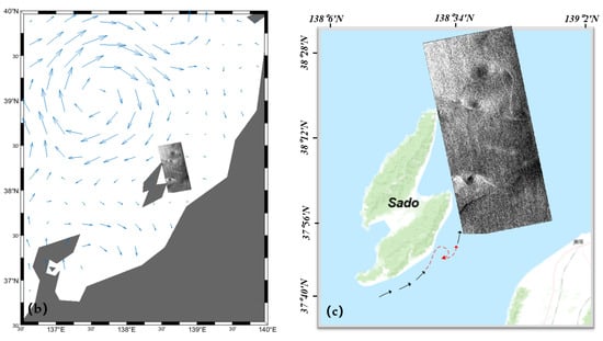 Figure 1a shows the #A VV-polarized backscatter coefficient image, which contains three suspected W-E with diameters of 12 km (E-1), 13 km (E-2), and 15 km (E-3) from bottom to top. These three regions are very similar to the W-E morphological structure that has been described in the literature [], with dark areas in the middle and bright areas on both sides. Data #A are located on the northeast side of Sado Island, and studies have shown that small eddies usually form near the coastline or between islands due to the interaction between the coastline and surface currents [,]. In addition, we performed a long time series analysis using OSCAR data, and the results indicate the presence of ocean eddies in the study area throughout the year. A snapshot of the surface geostrophic velocity field is given in Figure 2b, which shows the presence of a mesoscale eddy with a diameter of about 200 km in the upper left corner and the presence of an eastward surface current found on the southwest side of Sado Island. According to the study on eddy formation mechanisms in the literature [,,], we speculate that the eddies E-1, E-2, and E-3 are formed by the interaction between ocean currents and the northeast and southeast coasts of Sado Island (Figure 2c). In Figure 1a, eddies E-2 and E-3 are relatively faint, and E-1 is more apparent, most probably due to the attenuation of the eddy as it moves from the southwest side of Sado Island to the northeast side. It is worth noting that the observed eddies consist of two parts: bright stripes along the edges and a dark central area. The former is likely due to the interaction of the eddy-induced waves and currents increasing the roughness of the sea surface, resulting in a significant enhancement of the radar backscattering intensity. The latter may be caused by the eddy convergence effect polymerizing the marine oil film, resulting in a weakening of the backscattering intensity. In general, the W-E’s detection is focused on identifying the bright bands (i.e., bright edge areas) resulting from wave–current interaction effects. Therefore, these two components are discussed independently below.