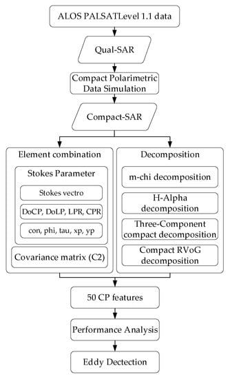 However, there is no relevant research on the use of CP SAR to observe ocean eddies. To develop CP SAR eddy detection technology, it is necessary to fully understand the response characteristics of CP SAR to ocean eddies. This study investigates the response characteristics of CP SAR to ocean eddies by extracting 50 types of CP features from 2 scenes of ALOS Phased Array type L-band SAR (PALSAR) data (the image covers the W-E and B-E) and then compares and analyzes the ocean eddy detection performance of the 50 features. On this basis, eddy detection and eddy information extraction experiments are conducted. This work contributes to developing subsequent work on CP SAR eddy detection and eddy refinement structure studies. The chapter structure of this article is as follows. Section 2 introduces the data and describes eddies. Section 3 introduces CP theory, CP data acquisition, and the feature extraction process. Section 4 conducts a comprehensive quantification and evaluation of CP features for eddy detection. Section 5 presents the eddy detection and eddy information extraction experiments. Section 6 discusses the results, and finally, the paper is concluded.