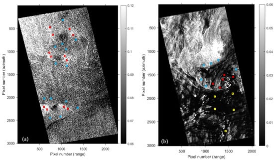 Regions of interest used in the analysis. The red, blue, and yellow boxes indicate the eddy outline, ocean background, and oil film, respectively. (a) Data #A. (b) Data #B. The size of the boxes is 50 × 50 pixels.