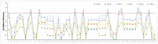 Euclidean distances between the eddies and seawater under the CP feature of data #A. The y-axis is the Euclidean distance, and the x-axis indicates the features (f1–f4 are , , , and , respectively, while c1–c50 are the corresponding features shown in Table 2). Among them, E1e-S, E1e-S, and E1e-S are the Euclidean distances between the edge regions and seawater for eddies E-1, E-2, and E-3, respectively, while E1c-S, E1c-S, and E1c-S are the Euclidean distances between the eddy center region and seawater, and the red dashed line indicates the Euclidean distance values between the eddies and the ocean background in the image.
