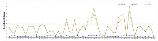 Euclidean distances between the eddies, oil film, and seawater under the CP feature of data #B. The y-axis is the Euclidean distance, and the x-axis indicates the features (f1–f4 are , , , and , respectively, and c1–c50 corresponding features are shown in Table 2). Eb-S is the Euclidean distance between the black spiral of the eddy and the seawater, Ew-S is the Euclidean distance between EW and the seawater, and O-S is the Euclidean distance between the oil film and the clean seawater. The red dashed line indicates the Euclidean distance between the eddies and the ocean background in the image, which is different from that of the B-E.