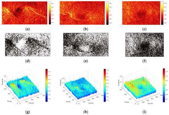 As shown in Section 4.2.1, the 10 polarization features (c44(Pd), c38(SEI), c21(Dbl), c5(g0), c8(g3), c24(l1), c33(lambda), c48(ms), c37(SE), and c45(Ps)) had better W-E characterization ability. In this section, the above features are used for W-E extraction, and it should be noted that since the detection of W-E is mainly to identify bright bands generated by wave–current interaction, only the edges of W-E are discussed in this section. The eddy detection results are shown with polarization feature c42(Pd) as an example. Figure 10 gives the comparison of the detection results for all three eddies (E-1, E-2, and E-3) in the CP feature c42(Pd) image. Figure 10a–c shows the eddy slices in the feature images, and it can be seen that the eddy visibility decreased sequentially. Figure 10d–f shows the eddy detection results based on the k-means classification algorithm (k = 2) [], with the ocean background in white and the extracted W-E edges in black. The detection results show that the edges were more seriously confused with the seawater. Among them, the detection result of E-1 was relatively good, and most of the eddy edges could be separated from the ocean background. This may have been caused by the eddy intensity as well as the local sea state. Figure 10g–i shows the three-dimensional image of the eddy region in the feature image, and it is noteworthy that the eddy centers had an obvious height difference from the eddy edges. The intensity of E-1 was relatively large, and the roughness of the sea surface caused by wave–current interaction was greater, which resulted in a larger difference in the backscattering between the eddy edge and the ocean background, therefore having a relatively good detection result. In addition, in order to describe the eddy detection accuracy quantitatively, we used the subjective identification of eddies by trained experts as the expert interpretation results and compared the detection results of the eddies in the above 10 features with the expert interpretation results to obtain the eddy detection accuracy (Table 5). It can be seen that the average detection accuracies of the 10 features were 69.83% (E-1), 34.72% (E-2), and 32.71% (E-3), all of which were better than the traditional (66.67%, 27.01%, and 26.12%, respectively).
