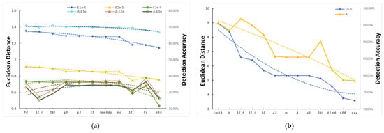Euclidean distance and eddy detection accuracy of CP features with better eddy detection performance. (a) W-E, where E1e-S, E1e-S, and E1e-S are the Euclidean distances between the edge regions of eddies E-1, E-2, and E-3 and seawater, respectively. A-E1e indicates the detection accuracy of E1e. (b) B-E, where Eb-S is the Euclidean distance between the black spiral of the eddy and the seawater. The colored dashed lines are the results of the third-order polynomial fit. The line marked “A” indicates the eddy detection accuracy.