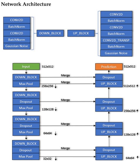A diagram of the network architecture used in this study. Down-sampling and up-sampling convolutional blocks are defined independently. Input data travel through a combination of down-sampling blocks, dropout, and pooling layers. The final down-sampled output is then passed through a combination of up-sampling blocks, dropout, and merge layers to create a final prediction of bathymetry. Figure from [].