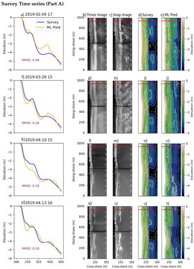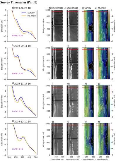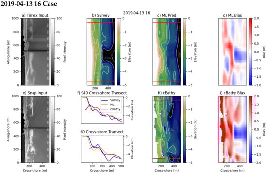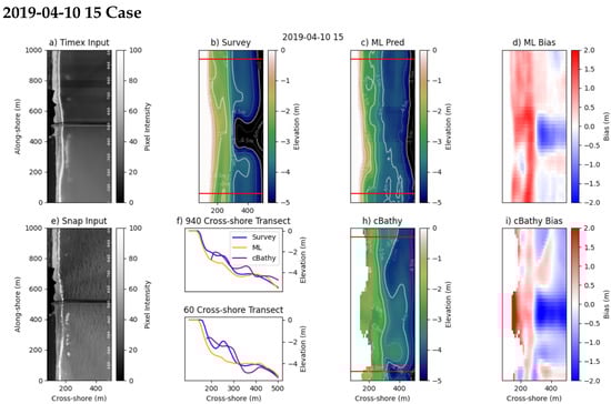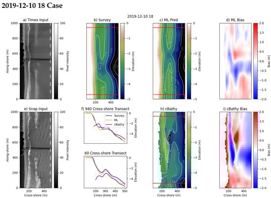The first example is from transect four in Figure 5 on 10 December 2019. This example case is a single-barred system, with a break in the bar near the pier. The ML model performs well along both the transects at 60 and 940 m along-shore (Figure 6f) and captures the overall shape of the full two-dimensional survey product when comparing Figure 6b,c. The model predicts a break in the sandbar that is farther north than the survey product indicates. This is likely due to the corresponding gap in wave breaking in the Timex imagery at that location, between 400 and 500 in the along-shore. We observe good agreement at deeper depths between the model and the survey, and clear wave crests are visible throughout the snap imagery in this region (Figure 6e). cBathy provides relatively complete depth estimates at this time, though it has higher error throughout, translating the sandbar onshore through much of the northern portion of the domain (Figure 6i).