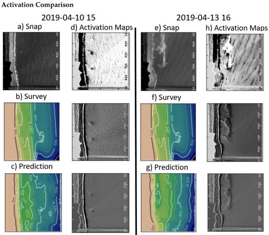 To explore the hypothesis that the visibility of wave crests in the snap image has a direct effect on the ability of the ML model to estimate depths, we examine activation maps within network layers. Activation maps display output values from a neural network layer as an image. Figure 9 shows the snapshot inputs for the two example cases from Figure 7 and Figure 8, along with the prediction, ground truth, and example activation maps for the northern portion of the domain. Similar to [], wave breaking and refraction patterns are visible in activation maps from some of the network layers, suggesting the model is using this information in its predictions. The snap image for 10 April has a less distinct wave field and breaking pattern, while the snap image for the 13 April case has more pronounced wave crests. These more pronounced wave crests are producing a stronger signal in the same activation maps (Figure 9h) than the shorter and harder-to-distinguish wave patterns from the earlier time period (Figure 9d). Qualitatively, improved model performance occurs when these images appear clearer to expert observation and are more similar to the images produced for the synthetic model training set in []. The enhanced ability of the model when there are clear and distinguishable wave refraction patterns mirrors the success criteria from other synthetic approaches and state-of-the-art satellite methods [,,,]. We hypothesize that the ML model is more successful at estimating water depths under these conditions of greater wave pattern coherence than in cases where visual artifacts or complicated sea states can hinder wave pattern identifications. Future work will endeavor to explore this hypothesis further.