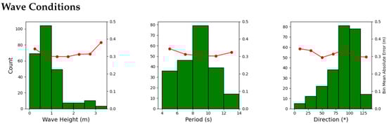 Model error across different wave conditions. (a) shows the mean error versus the wave height. (b) shows the mean error versus the wave direction. (c) shows the mean error versus the wave period.