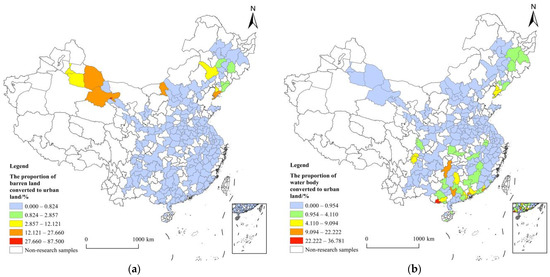The results in Table 6 only show that the first opening of HSR promotes the scale of the conversion of vegetation cover and cultivated land to urban land. However, China’s land has complex heterogeneity characteristics. The results in Table 6 cannot reflect the spatial differences of the impact of HSR on the conversion of non-urban land to urban land. Therefore, the next step is to visualize the impact of the first opening of HSR on the conversion of different types of non-urban land to urban land in the form of maps. This can reveal and compare the conversion of various kinds of non-urban land to urban land after the first opening of HSR in cities in different regions.