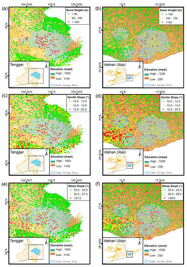 The locations, relative heights, gentle slopes, and steep slopes of all dunes in the Tengger Sand Sea and the Idehan Ubari Sand Sea were plotted on the following spatial distribution maps (Figure 5). In both sand seas, the relative heights of dunes in the lake group area are higher compared with the non-lake group areas, and both the gentle slope and the steep slope of dunes are steeper. These patterns are consistent with those of dunes in the Badain Jaran Sand Sea.