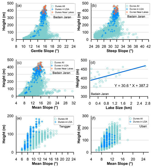 Scatter plots showing the relationship between the dune height and the (a) gentle (10–25°), (b) steep (>25°), and (c) mean (>5°) dune slopes; (d) the lake size (considered to be the square root of the lake area) in the Badain Jaran Sand Sea; and the relationship between the dune height and the mean (>5°) dune slopes in (e) the Tengger Sand Sea and (f) the Idehan Ubari Sand Sea. Blue crosses represent dunes in the lake group area (LGA). Orange crosses represent the dunes mapped to lakes. The blue line in (d) represents the linear fitting.
